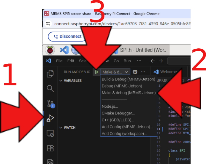 Click on drop-down list and select "Make & debug..." (2).