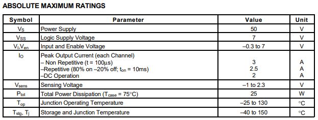 Iz tablice je vidljivo da maksimalna struja kod trajnog opterećenja iznosi 2A što je više nego izračunata struja za robota (1,65A) tako da možemo koristiti taj H-most za robota kojeg proračunavamo. Upravljački naponi su do 7V, a maksimalni napon motora 50V.