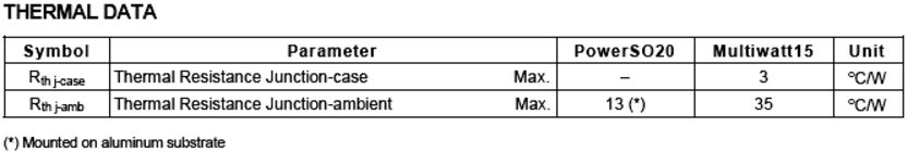 Podaci za kućište Multiwatt15 nisu pronađeni, ali se na osnovu drugih dostupnih podataka može procijeniti temperaturni otpor kućište-hladilo na Rth case-HS = 0,8°C/W.