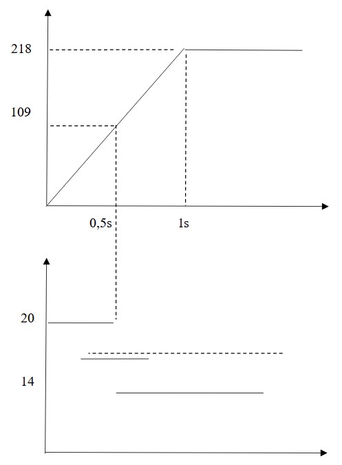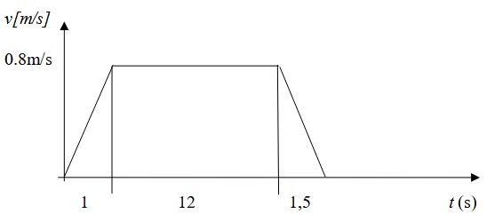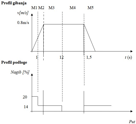 Pretpostavimo da robot radi u režimu predstavljenom na Slici 2. Sa Slike 2.(Profil gibanja) vidi se da robot mora ubrzavati do maksimalne brzine od 0,8m/s za jednu sekundu, zatim se kreće postignutom brzinom od 0,8ms (jednoliko gibanje) 12 sekundi te na kraju uspori do stanja mirovanja za 1,5 sekundi.