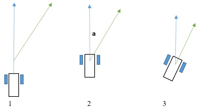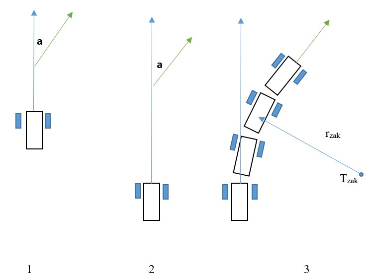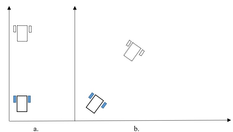 Na Slici 2. prikazane su početne i očekivane pozicije robota (crtkano) za različite početne pozicije. Određivanje stvarne pozicije robota u koordinatnom sustavu ovisi o početnoj poziciji i putu koji napravi robot.