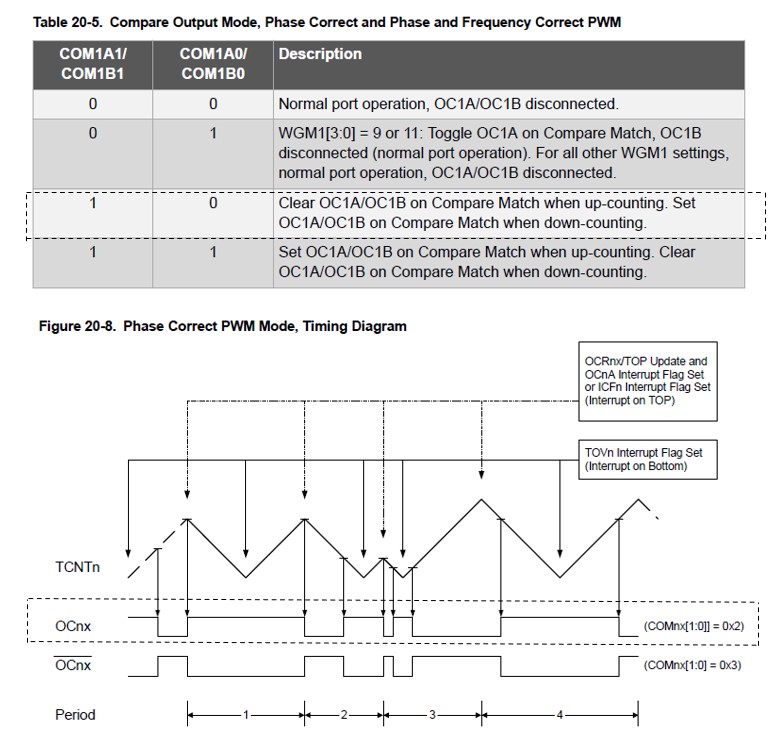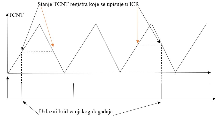 Nakon pred-procesorskih naredbi program svakih 200ms odlazi u ISR(TIMER5_COMPA_vect) prekidnu rutinu gdje prikuplja podatke brojača. Na svaki uzlazni brid kanala B enkodera lijevog kotača program odlazi u ISR(INT0_vect). Kanal B enkodera priključen je na alternativnu (perifernu) jedinicu INT0 koja detektira uzlazni brid. Na priključku PE6 priključen je A kanal istog enkodera. U rutini vanjskog prekida INT0 ispituje se registar PIN, bit 6 grupe priključaka E (PORT-a E) koji je postavljen kao ulazni s priključenim PULL-UP otpornikom. Ispitivanje se provodi kao uvjet grananja i ukoliko je rezultat PINE6==0 zaustavlja se brojač i povećava se vrijednost varijable „smal“, odnosno program je ustanovio da je kanal B enkodera u logičkoj „0“, odnosno robot se giba unazad. Vidi Slika 1. Ukoliko uvjet nije zadovoljen odnosno PINE==1 tada se omogućuje povećanje stanja brojača. U prekidnoj rutini ISR(TIMER5_COMPA_vect) se oduzima stanje varijable „smal“ od stanja TCNT3.